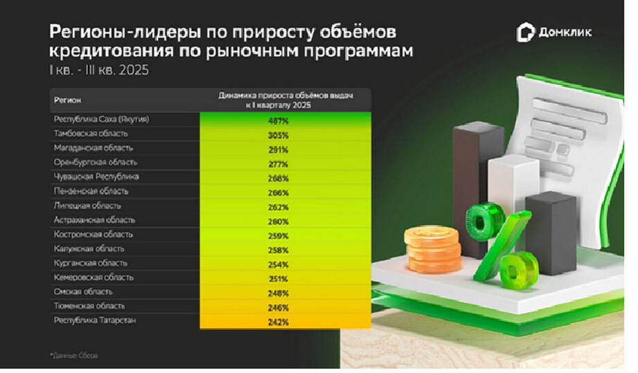 По итогам III квартала 2025 года объёмы выдач Сбера по рыночным программам увеличились практически на 200% к I кв. 2025 года. Наибольший прирост объёмов выдач по отношению к I кв. 2025 года зафиксирован в Якутии (почти в 6 раз), Тамбовской и Магаданской областях (приблизительно в 4 раза). Эти цифры свидетельствуют о позитивной реакции рынка и восстановлении спроса на фоне снижения ставок.