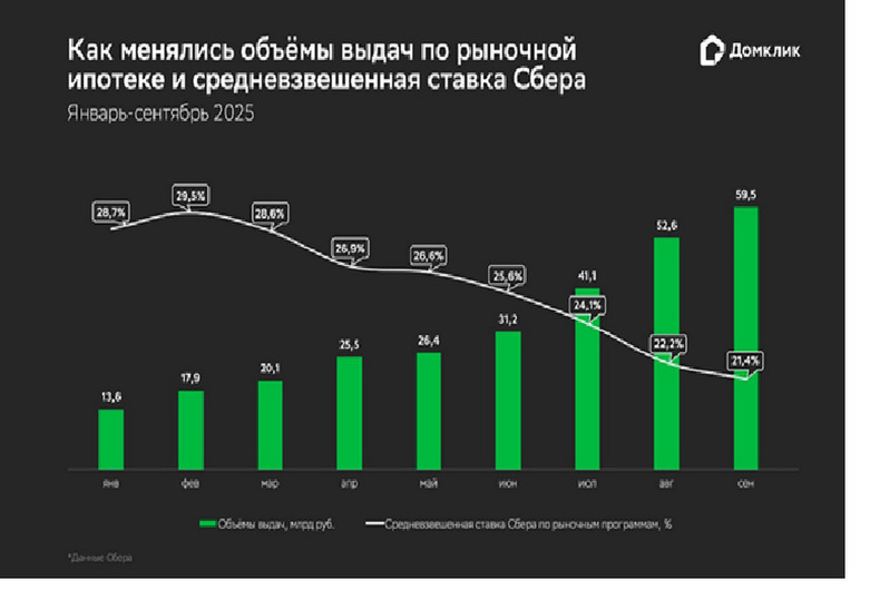 Как менялись объёмы выдач по рыночной ипотеке и средневзвешенная ставка Сбера по рыночным программам в 2025 году