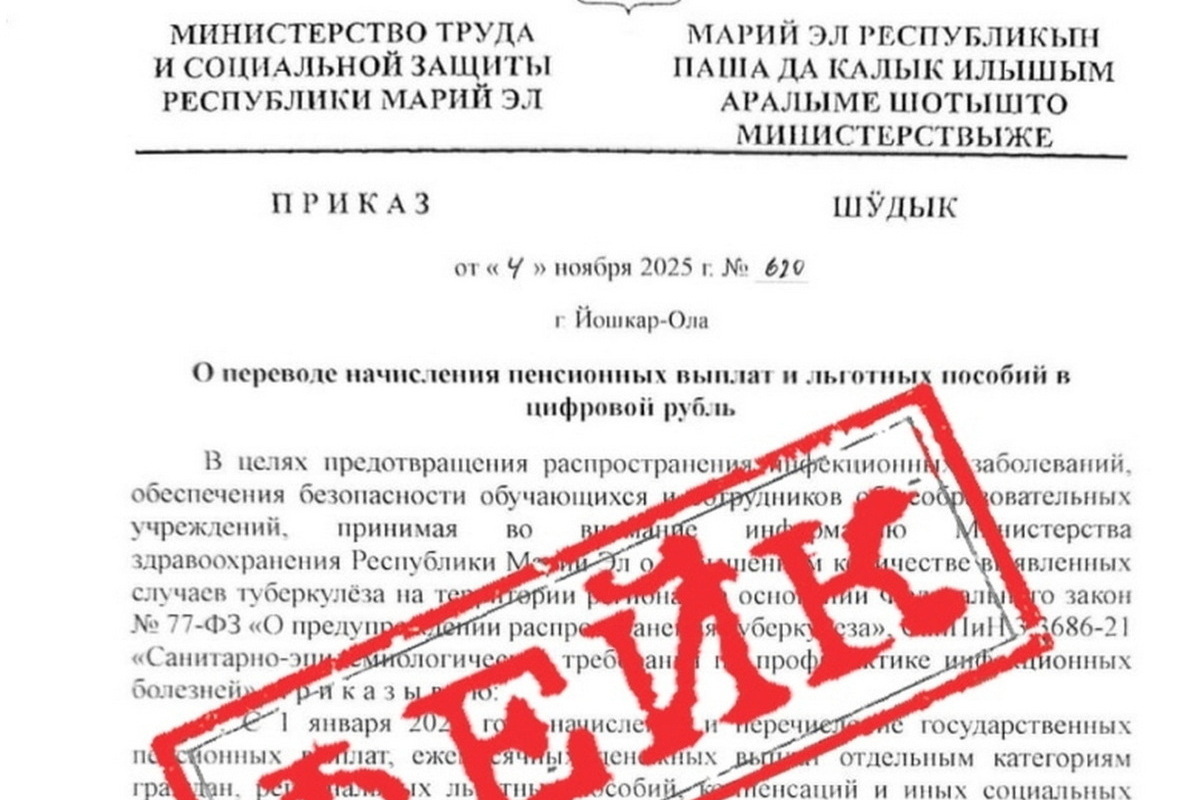 В социальных сетях Марий Эл распространяется ложный приказ о переводе начисления пенсий и других выплат в цифровой рубль.