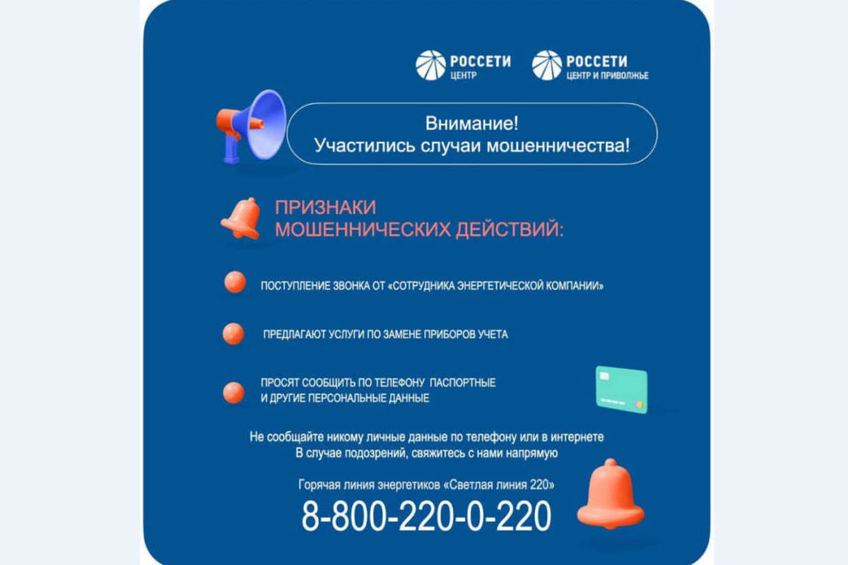 Для предотвращения случаев мошенничества придерживайтесь следующих рекомендаций: никогда не сообщайте по телефону свои личные данные, такие как СНИЛС, паспортные данные или данные банковских карт. Все вопросы, касающиеся замены приборов учета, решаются исключительно через официальные уведомления от ПАО «Россети Центр».