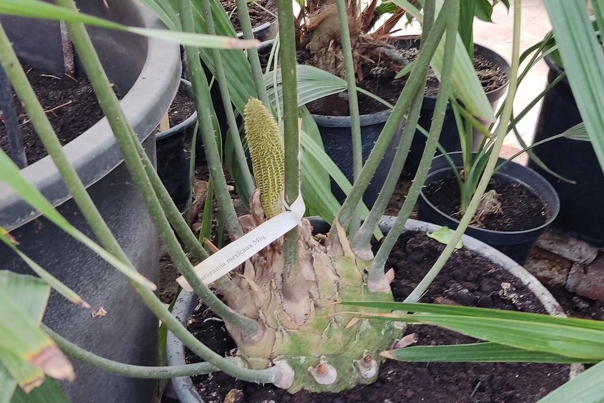 В здешней оранжерее растет небольшое дерево из древней группы саговников. Цератозамия мексиканская в диком виде встречается в центральной Америке, на юго-востоке Мексики. Она вырастает до полуметра, при этом ствол достигает в толщину до 20 сантиметров. Он покрыт основаниями опавших листьев и похож на панцирь.
