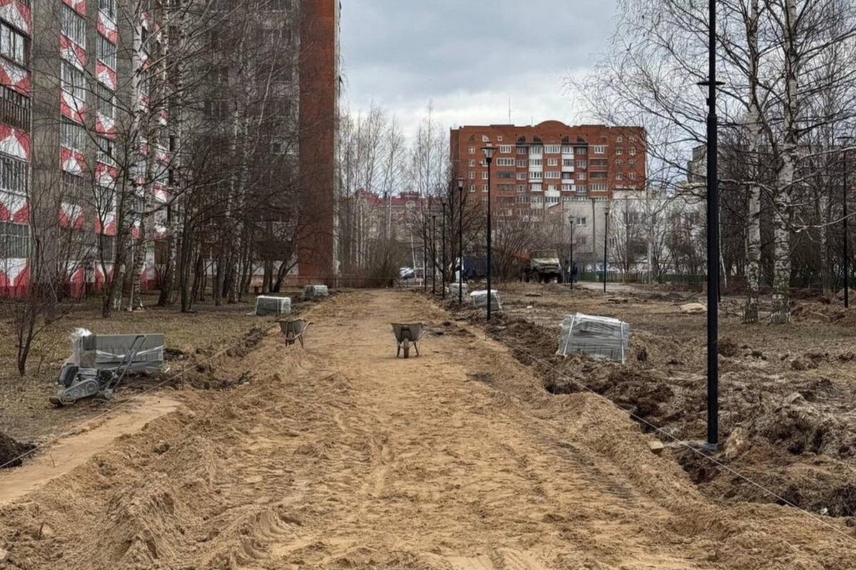 Сейчас рабочие занимаются подготовкой основания для дорожных покрытий, установкой бортовых камней и новых светильников.