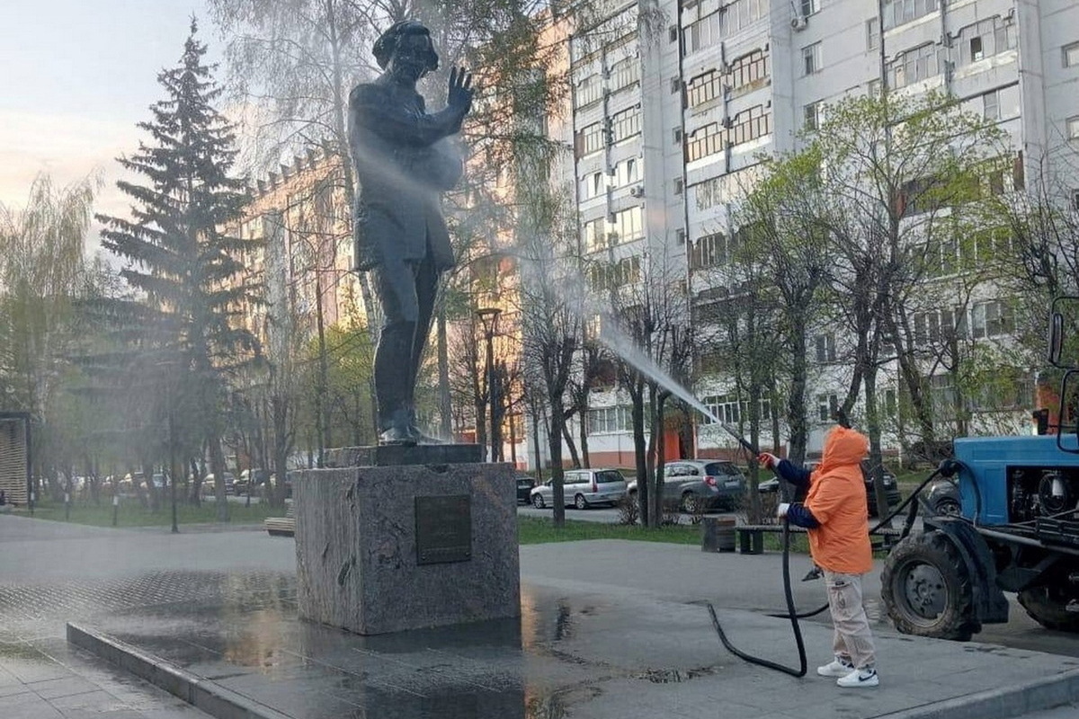 Каждый день им нужно собирать мусор из урн и с газонов, грязь с проезжих частей. В эти апрельские дни работники АО «Город» также помыли памятники на бульваре Чавайна.