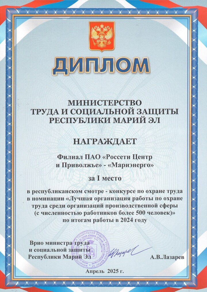 На церемонии награждения в рамках республиканского совещания, посвященного Всемирному дню охраны труда, представители министерства поблагодарили энергетиков за активную работу и отметили, что в филиале «Мариэнерго» полноценно реализуются регламентируемые Трудовым кодексом Российской Федерации обязанности работодателя по обеспечению безопасных условий и охраны труда.