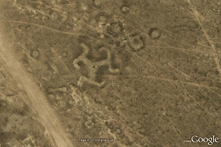 В казахской пустыне найдены огромные изображения свастик и другие геоглифы – крупные рисунки на земле, сделанные древними людьми. Они изучены, известно, что им около трех тысяч лет. Размеры составляют от 90 до 400 метров.