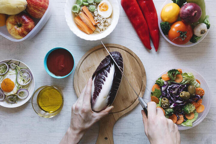 Попробуйте придерживаться метода "тарелки" при составлении своего рациона. Это значит, что половина вашей тарелки должна быть заполнена свежими овощами, а другую половину можно поделить на пополам для гарнира из цельнозерновых продуктов и мяса.