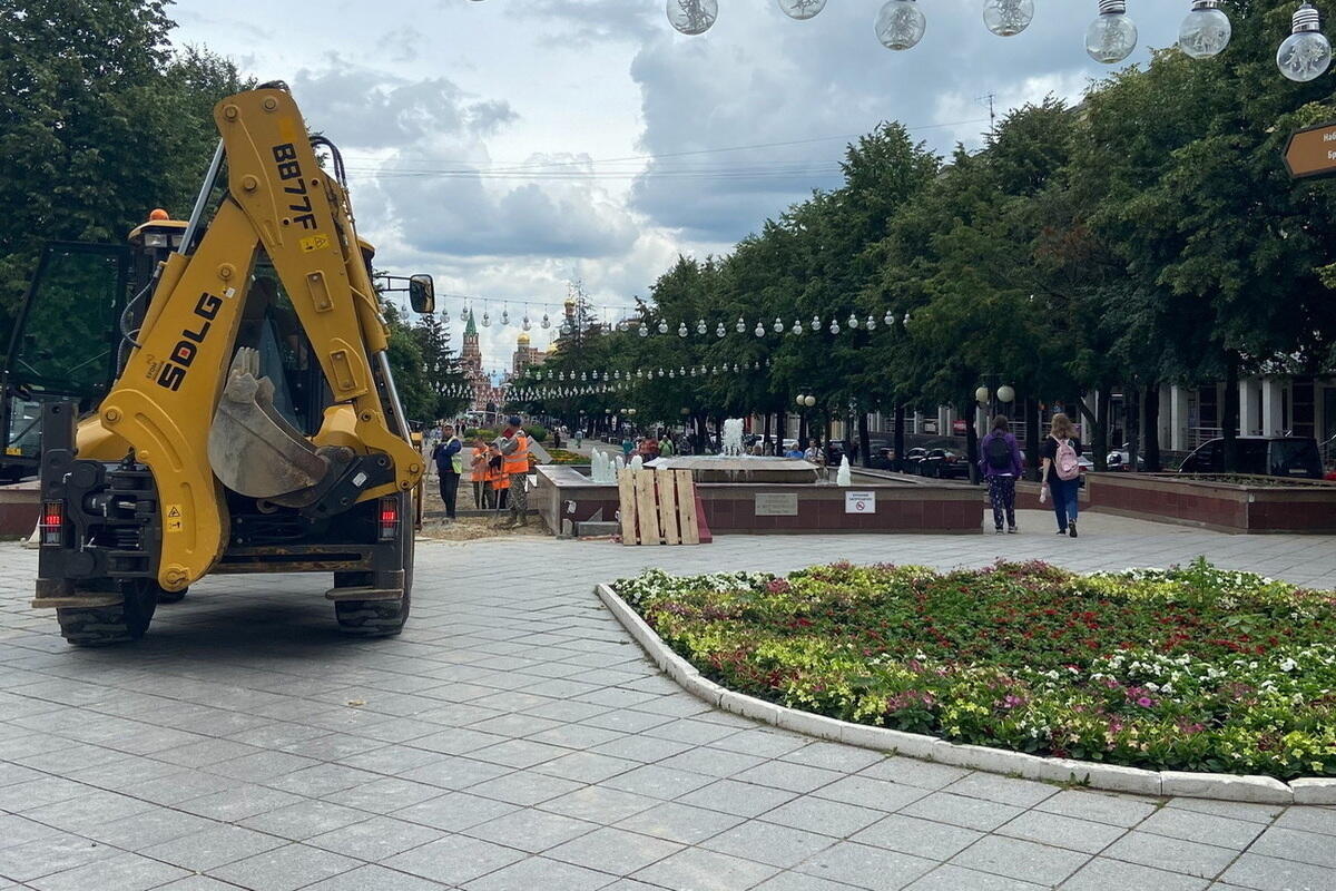 Работы ведутся на участке между улицами Комсомольской и Советской. Будут заменены поврежденные плитки, заново устроены ступени и пандусы у большого фонтана.