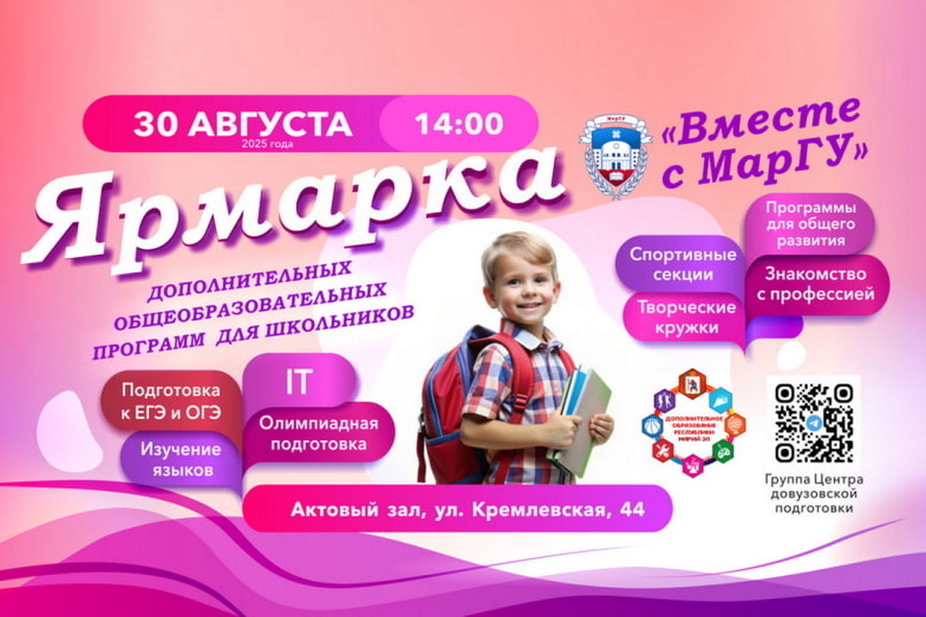 30 августа в Марийском государственном университете состоится Ярмарка дополнительных образовательных программ «Вместе с МарГУ», где родители и школьники смогут узнать о возможностях подготовки к экзаменам, олимпиадам и развитии ребёнка в творчестве, спорте и профессии.