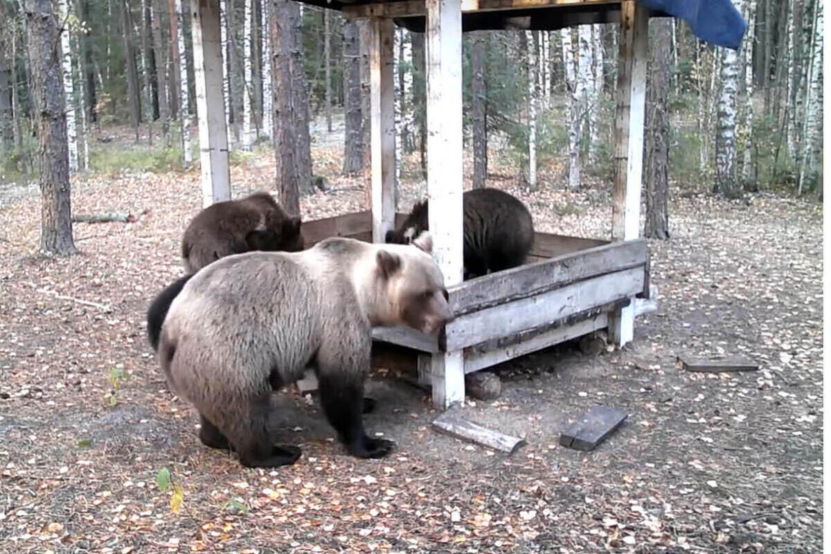 В эти октябрьские дни медведи продолжают нагуливать жир, путешествуют в поисках орехов, желудей и ягод, которые нынче неплохо уродились. Кроме того, в лесу установлены кормушки. Они сделаны для того, чтобы медведи не покидали привычную для них территорию обитания.