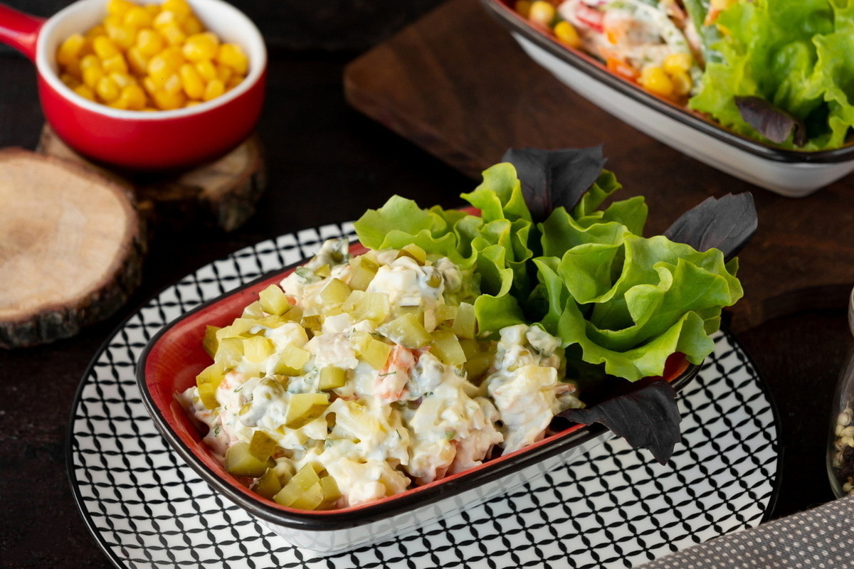 Изначально это был простой салат, где все ингредиенты резались кубиком и смешивались. Для праздника его сделали слоеным, и он стал выглядеть нарядно, как торт.