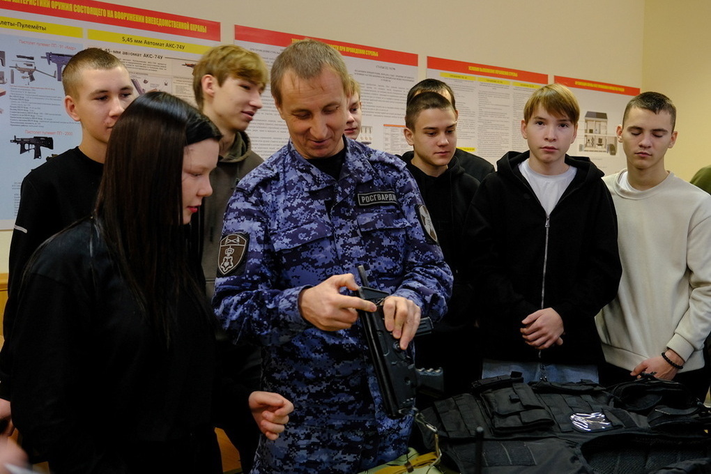 Знакомство началось с подразделения вневедомственной охраны Росгвардии, где сотрудники рассказали гостям о своих задачах и показали форменное обмундирование. Студенты с интересом слушали сотрудников и примеряли на себя экипировку. Каждый из элементов снаряжения давал ощущение веса ответственности, который ежедневно несут на своих плечах сотрудники Росгвардии.