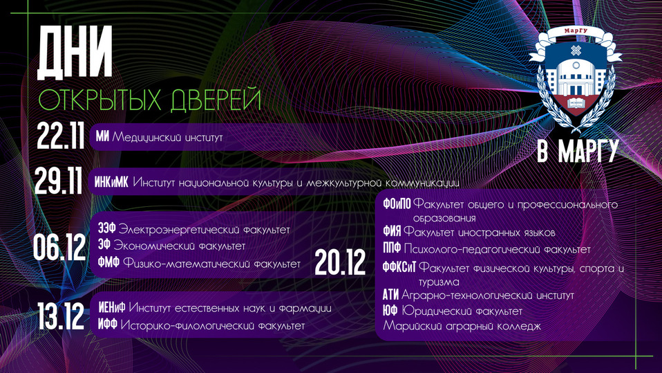 Марийский государственный университет объявляет о начале Дней открытых дверей! Вы сможете познакомиться с преподавателями факультетов и институтов и студентами-активистами, определиться с направлением подготовки, будущей профессией и своими глазами увидеть учебные аудитории, научные лаборатории и центры университета.